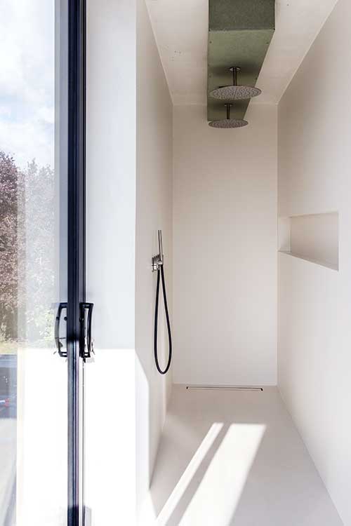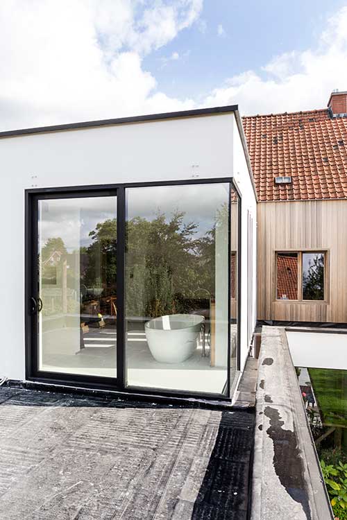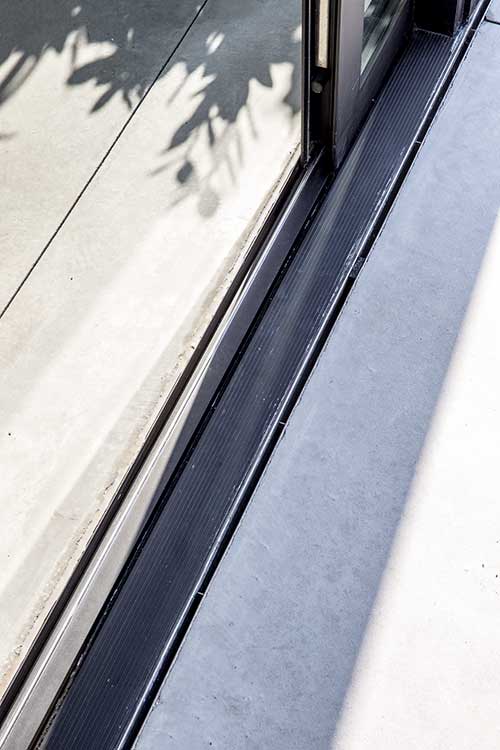 Ja ook met ramen kan u veel doen. Dankzij dit lijnenspel van de ramen krijgt u een interessant uiterlijk van de ruimte, terwijl u ook nog eens de voordelen erbij krijgt van veel lichtinval en een ruimtelijk gevoel. Dit lijnenspel wordt nog eens benadrukt doordat de ramen doorlopen in de vloer, zowel buiten als binnen.