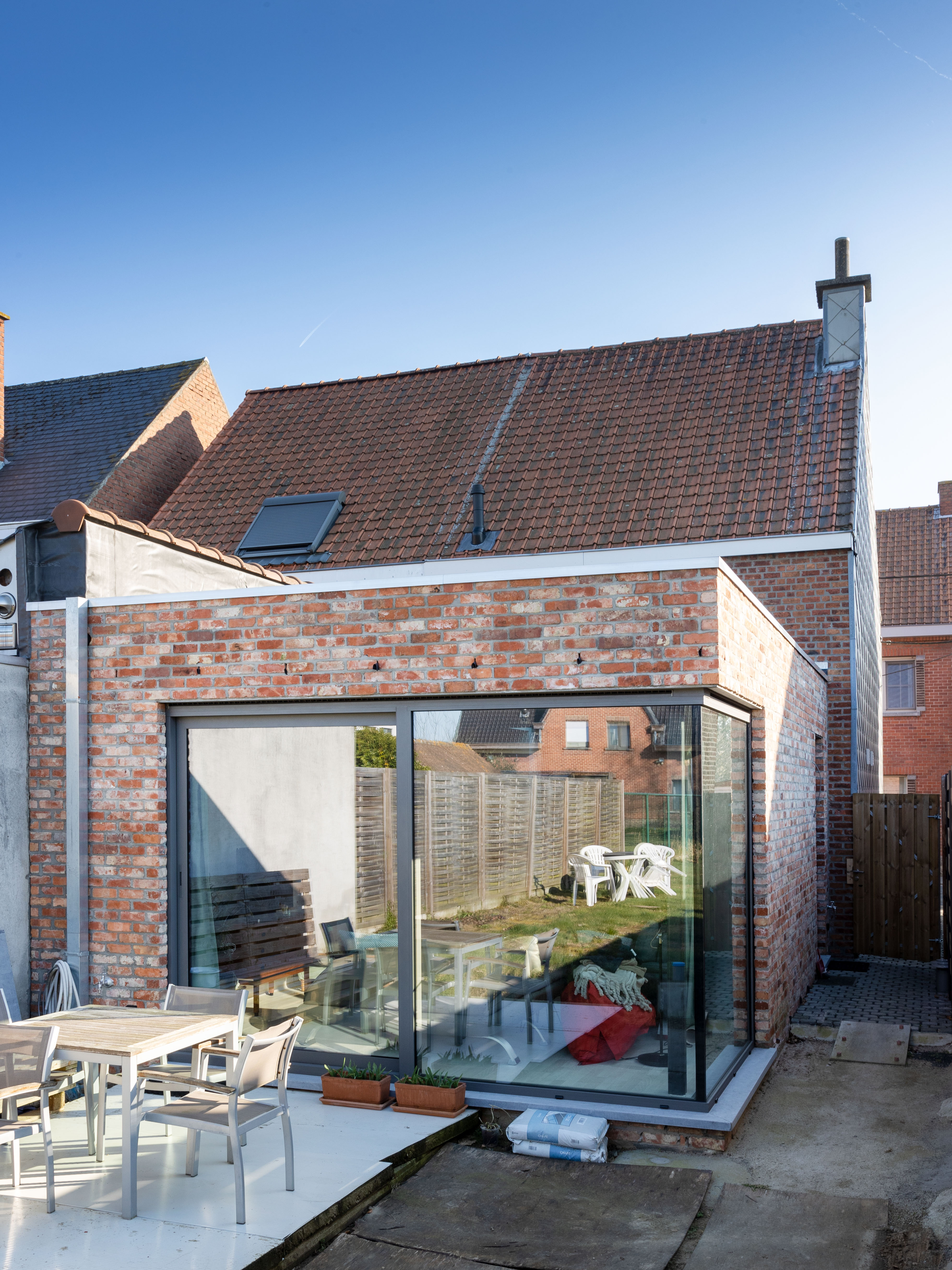 Deze rijwoning werd volledig onder handen genomen. Zo namen we alle metsel- en dakwerken voor onze rekening. De grootste uitdaging was ongetwijfeld de plaatsing van een volledig gescheiden rioleringsstelsel en infiltratiebekkens. Doordat de doorgang heel smal was, hebben we al ons graafmateriaal aangepast. Een flinke karwei met een mooi resultaat.